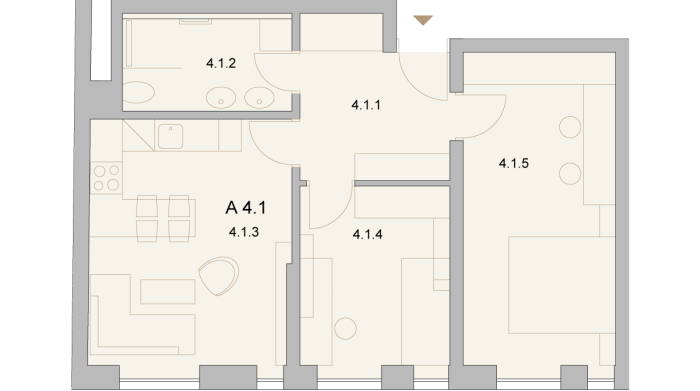 Tato jednotka je vzorová. Konkrétní řešení ostatních bytů 3+kk se může lišit. Vyobrazené zařízení interéru v plánech bytů a vizualizacích (kuchyňské linky, nábytek, květiny apod.) není předmětem dodávky. Povrchy jednotlivých místností viz standardy. Čerchované čáry v plánku znázorňují konstrukce nad rovinou řezu.
